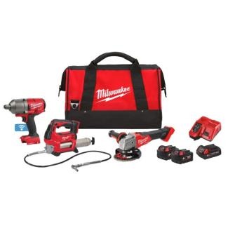 Zestaw (1x M18ONEFHIWF34 – Młot udarowo-obrotowy / 1x M18GG – Pistolet do smarowania / 1x M18FSAG125X – Szlifierka kątowa / 2x M18B5 – Akumulator / 1x M18B2 – Akumulator / 1x M12-18FC – Ładowarka / 1x Torba